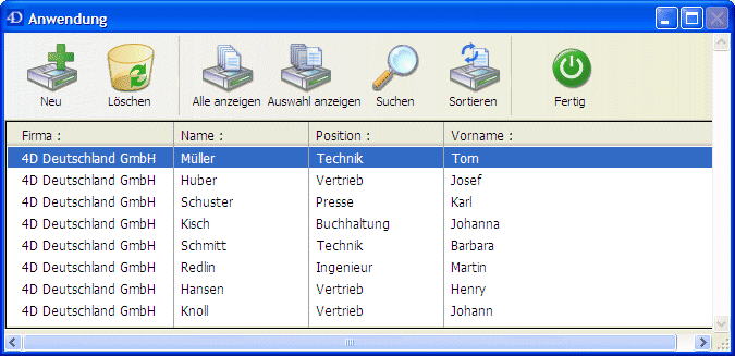 Der Datenbereich wird dynamisch erweitert, wenn das Fenster angepasst wird, während Kopfteil und Fußteil ihre feste Größe behalten.Ein Formular, das Datensätze auf dem Bildschirm anzeigt, kann im Kopfteil weitere klickbare, nicht eingebbare Objekte enthalten wie Schaltflächen, hierarchische Listen, etc.. Weitere Informationen hierzu finden Sie im nächsten Abschnitt.