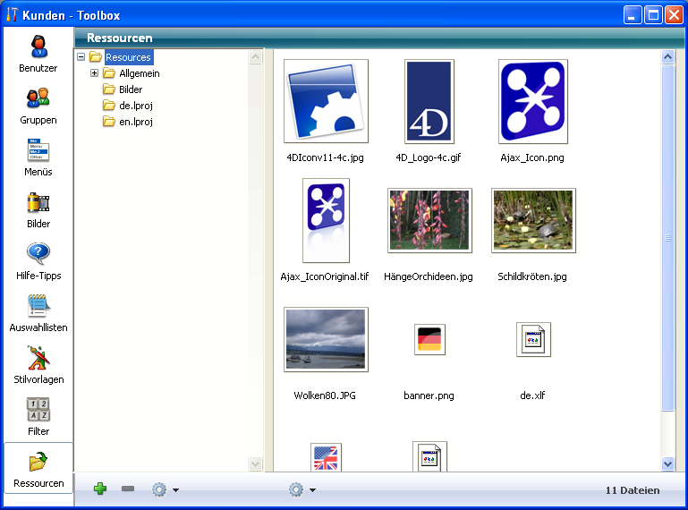 Um die Verwaltung dieses Ordners in einer Client-/Server Architektur zu vereinfachen, wird mit 4D Version 11.2 das Tool Ressourcen Explorer eingeführt. Sie können es über die 4D Tool Box aufrufen: