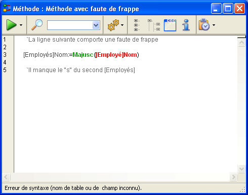 Vous pouvez alors corriger l'erreur de frappe et appuyer sur la touche Entrée (du clavier numérique) pour valider la correction. Pour plus d'informations sur l'éditeur de méthodes, reportez-vous au manuel Mode Développement de 4D.
