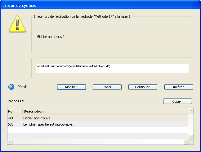 Certaines erreurs ne peuvent être détectées que lorsque vous exécutez la méthode. La fenêtre Erreur de syntaxe est affichée lorsqu'une telle erreur est détectée. Par exemple :