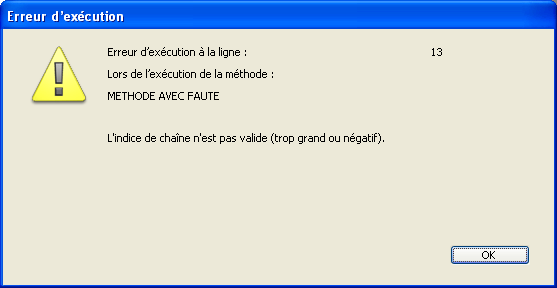 Ce message vous indique que vous essayez d'accéder à un caractère dont la position se trouve au-delà de la longueur de la chaîne. Pour trouver rapidement l'origine du problème, notez le nom de la méthode et le numéro de la ligne, ouvrez votre base en mode interprété puis allez à la méthode et à la ligne indiquées.
