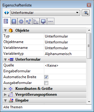 Unterformulare als Seite können die Daten des aktuellen Unterdatensatzes oder, je nach Kontext (Variablen, Bilder, etc.), jede Art von dauerhaftem Wert anzeigen. Ein Hauptvorteil dieser Unterformulare ist, dass sie ergänzende Funktionalitäten haben und direkt mit dem Elternformular (Widgets) interagieren können. Unterformulare als Seite haben auch eigene Eigenschaften und Ereignisse; sie lassen sich komplett per Programmierung steuern.