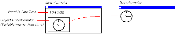 Die dem Unterformular zugewiesene Variable ermöglicht, beide Kontexte (Formular und Unterformular) miteinander zu verbinden, um komplexen Oberflächen den Endschliff zu geben. Nehmen wir zum Beispiel ein Unterformular mit einer dynamischen Uhr, die in ein Elternformular eingefügt wird, das wiederum eine eingebbare Variable vom Typ Zeit enthält: