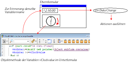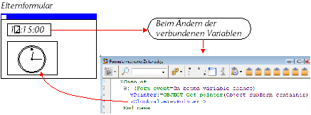 Hinweis: Bewegen Sie die Zeiger der Uhr manuell, wird das Formularereignis On Data Change ebenfalls in der Objektmethode der Variablen clockValue im Unterformular generiert.