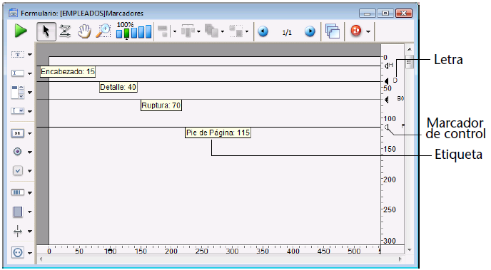O tamanho das áreas de cabeçalho, detalhe, quebra e pé de página são ajustados movendo os marcadores de controle de saída.