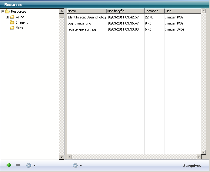 O explorador de recursos permite visualizar e modificar o conteúdo da pasta Resources do banco atual. Conta com vários controles para a adição, eliminação, busca e visualização dos elementos de recursos.