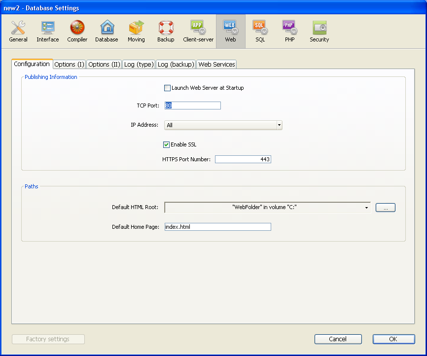 A instalação desses elementos possibilita a utilização do SSL nas conexões ao servidor web 4D. Entretanto, para que as conexões SSL sejam aceitas pelo servidor web 4D, deve “ativar” SSL. Este parâmetro é acessível na página Web, aba Configuração das Propriedades da banco: