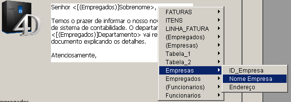 4D insere <Nome do campo> ou <[Nome da tabela]Nome do campo> na área de texto no ponto de inserção.