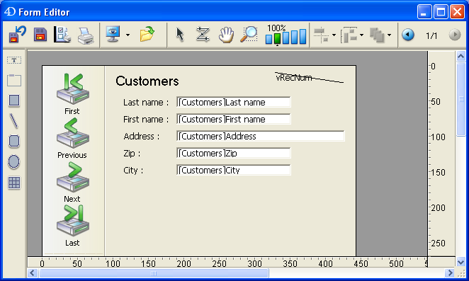 This editor uses the standard 4D Form editor interface, in particular the two integrated toolbar concept (tools and objects). It also has its own specific functions.