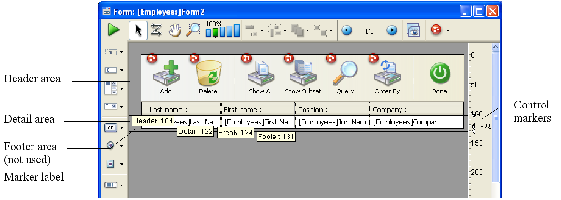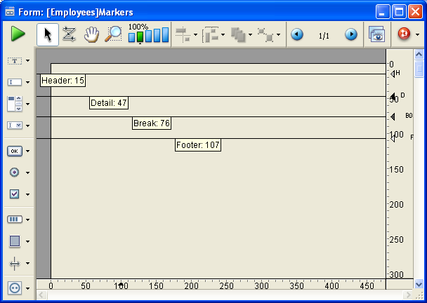 If you don’t want to print any details, drag the Detail marker on top of the Header marker. If you don’t need a Header, drag the Header marker to the very top of the form (at point 0).