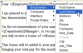 • データベース中のフィールドをいずれも使用できます。カレントテーブルのフィールドの場合、テーブル名を指定する必要はありません。つまり以下のように記述できます: <FieldName>。他のテーブルのフィールドを使用する場合、テーブル名を指定する必要があり、以下のように記述します: <[TableName] FieldName>。フォームを印刷する際、テキストエリア中の<FieldName>要素はレコードごとにそのフィールドの値で置き換えられます。