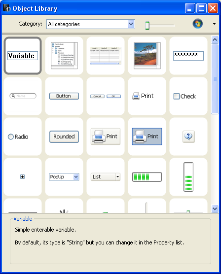 - Object filtering: The objects are classified in different categories (buttons, entry areas, etc.). To restrict the selection to a category of objects, select it from the pop-up menu or choose All categories to display all the objects objets.