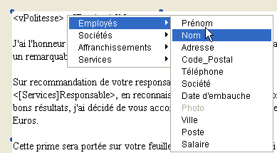 Vous pouvez spécifier la manière dont sera affiché le champ ou la variable en insérant un point virgule suivi d’un format d’affichage. Par exemple, la variable <vAugment;### ##0.00 Euros> calcule le montant du bonus de la personne et l’affiche dans un format adéquat. Pour plus d’informations sur les formats d’affichage, reportez-vous au paragraphe Formats d'affichage.