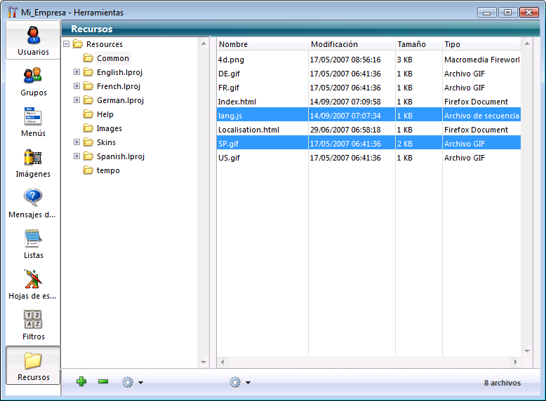 Nota: no es posible borrar la carpeta Resources. - Expandir todo/Contraer todo: expande o contrae todas las carpetas de la lista.