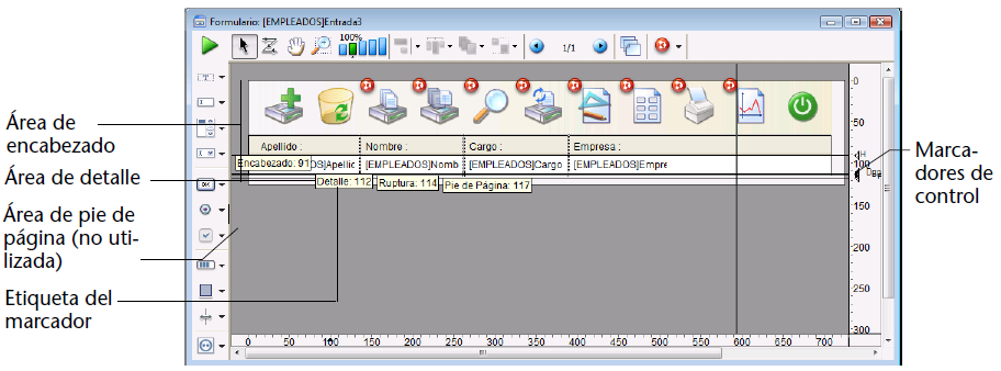 Atención: los objetos activos (campos o variables) ubicados en el detalle de los formularios no debe traslapar el área de encabezado o de pie de página, de lo contrario no se mostrarán cuando el formulario se ejecute.