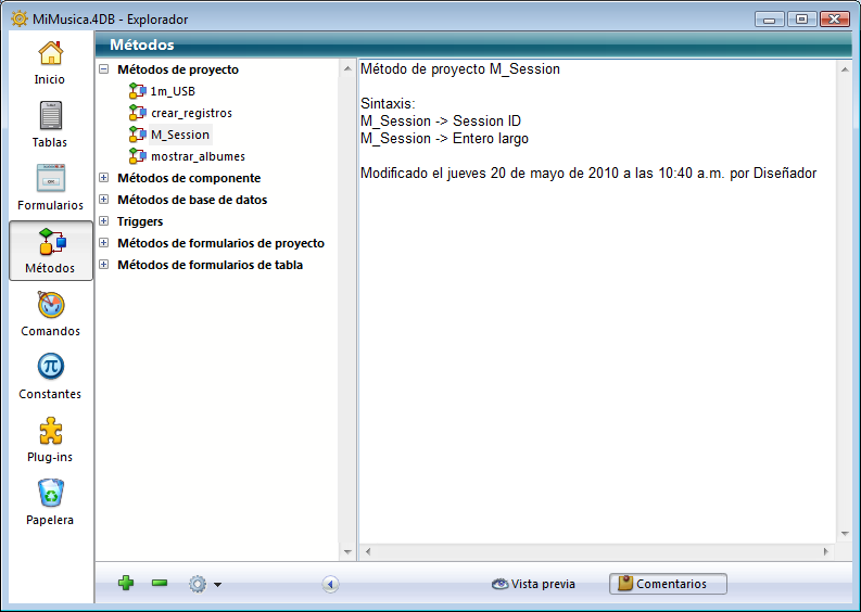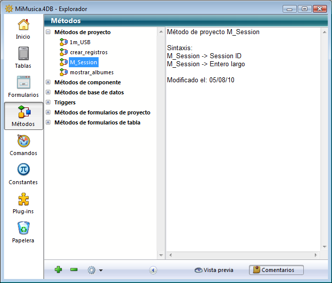 • métodos (base, componentes, proyecto, triggers y formulario),