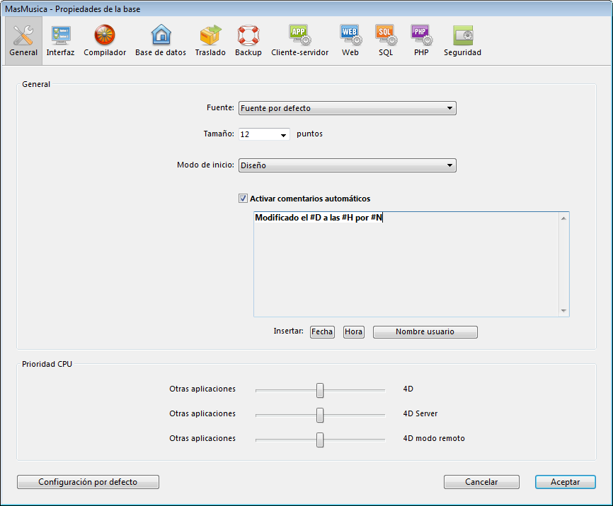 4D Server: los comentarios automáticos pueden ser modificados por todo equipo cliente con acceso a las Propiedades de la base. También puede modificar estos parámetros en las Propiedades de la base en el equipo servidor. Toda modificación efectuada en la página de comentarios automáticos es tenida en cuenta de inmediato por cada equipo cliente tan pronto como se modifica un objeto comentado.