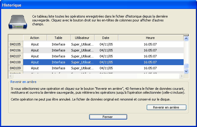 Cette boîte de dialogue comporte le bouton Revenir en arrière, permettant d’annuler des opérations effectuées sur les données de la base. Pour plus d’informations sur cette boîte de dialogue, reportez-vous au manuel Mode Développement de 4D.