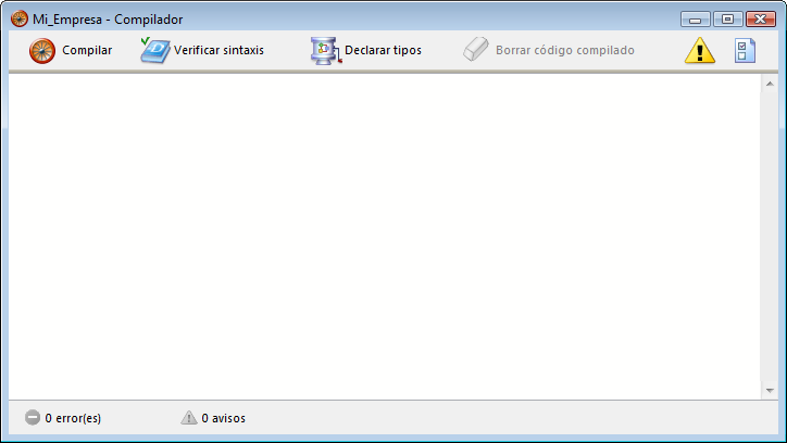 Esta ventana se utiliza para lanzar la compilación de la base o para verificar la sintaxis de los métodos. Además, los botones permiten generar/regenerar los métodos de declaración de la base de datos, borrar código compilado, mostrar u ocultar advertencias y acceder directamente a las Propiedades de la base.
