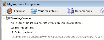Nota: el número de errores encontrados durante sus primeras compilaciones puede ser desalentador, pero no deje que esto lo desanime. Pronto descubrirá que tienen el mismo origen, es decir, no cumplir con ciertas convenciones de la base. El compilador siempre da un diagnóstico preciso de los errores con el fin de ayudarlo a corregirlos.
