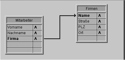 Laden Sie einen Datensatz der Tabelle [Mitarbeiter], wird der entsprechende Datensatz der Tabelle [Firmen] geladen. Der Inhalt des Datensatzes der Tabelle [Firmen] steht dem Datensatz der Tabelle [Mitarbeiter] zur Verfügung. Die aktuelle Auswahl der verknüpften Tabelle besteht also aus einem einzigen Datensatz, dem der Firma, zu der der Mitarbeiter gehört.