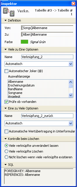 Der Bereich SQL der Inspektorpalette zeigt Informationen, die beim Bearbeiten der Struktur mit der SQL Programmiersprache hilfreich sind. Für Verknüpfungen erscheinen die Eigenschaften FOREIGN KEY und REFERENCES.