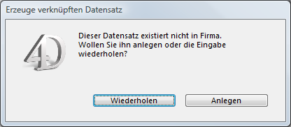 Prüfe ob vorhanden:Ist dieses Optionsfeld aktiv, erscheint ein Dialogfenster, in dem der Benutzer den verknüpften Eine-Datensatz neu anlegen kann, falls er noch nicht vorhanden ist. Tragen Sie einen Wert in ein verknüpftes Datenfeld der Viele-Tabelle ein, überprüft 4D, ob in der verknüpften Eine-Tabelle ein passender Datensatz vorhanden ist. Ist das nicht der Fall, erscheint folgendes Dialogfenster: