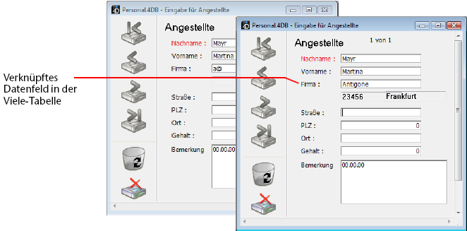 Automatische Wertübertragung: Mit dieser Option können Sie den Wert des Primärschlüsselfeldes in der Eine-Tabelle bei der Dateneingabe automatisch dem verknüpften Datenfeld in der Viele-Tabelle zuweisen. Diese Option ist nur sinnvoll, wenn für die zurückgehende Verknüpfung die Option automatisch gewählt wurde. Diese Option beeinflusst die Dateneingabe, wenn ein Eingabeformular in einer Eine-Tabelle ein Unterformular in einer Viele-Tabelle hat. Weitere Informationen dazu finden Sie im Abschnitt Unterformulare und Widgets. Ist Automatische Wertübertragung aktiviert, kann der Benutzer in einem Unterformular Daten hinzufügen, d.h. in der verknüpften Viele-Tabelle, die dann den Datenfeldern der verknüpften Tabelle automatisch zugewiesen werden. In der Verknüpfung zwischen der Tabelle [Firma] und der Tabelle [Angestellte] ist [Firma] die Eine-Tabelle und [Angestellte] eine verknüpfte Viele-Tabelle. Für jede Firma gibt es einen Datensatz in der Tabelle [Firma] und mehrere Datensätze in der Tabelle [Angestellte]. Erscheint das Primärschlüsselfeld der Viele- Tabelle im Unterformular, können Sie die Auswirkung dieser Option betrachten: Der Feldwert erscheint bei jedem Hinzufügen eines Unterdatensatzes automatisch im Unterformular: