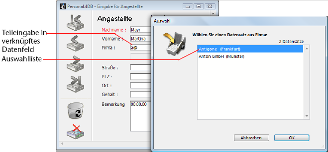 Joker-Auswahlliste n der Liste der Joker-Felder können Sie ein zusätzliches Feld auswählen, das in der Liste der Werte erscheint und zwar, wenn der Benutzer bei der Dateneingabe in das verknüpfte Feld den Joker eingibt. Das funktioniert folgendermaßen: Der Benutzer kann sich Werte in der Eine-Tabelle Werte ansehen, während er Daten in das verknüpfte Datenfeld der Viele-Tabelle eingibt. Hierzu verwendet er einfach im verknüpften Datenfeld das Jokerzeichen @. 4D sucht dann in der verknüpften Eine-Tabelle nach der entsprechenden Eingabe. Sie können das Jokerzeichen auf zweierlei Art einsetzen: Um eine Teileingabe zu vervollständigen oder um eine Liste gültiger Eingaben anzuzeigen. Wenn die Liste angezeigt wird, kann der Benutzer die Eingabe aus der Liste wählen. Zum verknüpften Datenfeld kann ein zusätzliches Feld, das Joker Auswahlfeld, angezeigt werden. Nehmen wir z.B. an, der Benutzer erstellt einen Datensatz in der Tabelle [Angestellte]. Anstatt in das Firmenfeld Anton GmbH zu schreiben, tippt der Benutzer A@ und drückt die Tabulatortaste, um in das nächste Datenfeld zu gehen. Da @ bei 4D das Jokerzeichen ist, bedeutet diese Eingabe "Dieser Wert beginnt mit "A", gefolgt von irgend etwas". 4D sucht in der verknüpften Tabelle nach dem Datensatz, der zu dieser Eingabe passt. Wird ein Datensatz gefunden, vervollständigt es die Eingabe und wählt das nächste Datenfeld in der Reihenfolge der Dateneingabe. Die folgende Abbildung zeigt, wie sich der Einsatz des Jokers auswirkt