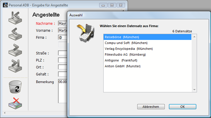 Sie können als Hilfe für den Benutzer, welche Firma er wählen soll, ein zweites Datenfeld der Liste festlegen. Dieses zweite Datenfeld ist das Datenfeld der Joker-Auswahlliste, das Sie in der Inspektorpalette beim Erstellen der Verknüpfung festgelegt haben. Nachfolgende Abbildung zeigt eine Liste von Firmen, in der Firmenname und Ort angezeigt werden. Dieses Joker-Auswahlfeld hilft dem Benutzer, der beispielsweise nicht weiß, ob die Firma Adams oder Akon heißt, sich aber erinnert, dass die Firma in München ansässig ist. Um eine Liste aller Firmen aus der Tabelle [Firma] anzuzeigen, gibt der Benutzer nur @ ein. 4D zeigt dann eine Liste aller Firmen, und der Benutzer kann die korrekte Firma wählen: