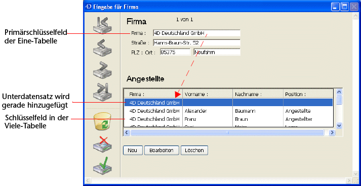 Manuell, wenn das Schlüsselfeld angezeigt wird: Im obigen Beispiel genügt es, im Datenfeld Firma jedes Unterdatensatzes den Namen „4D Deutschland GmbH“ einzugeben