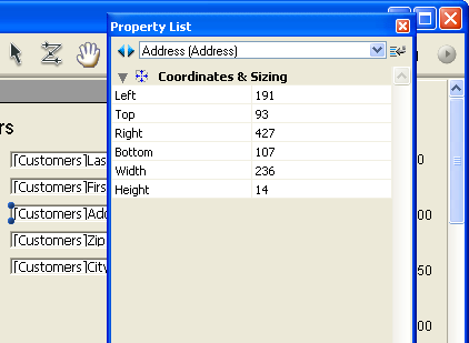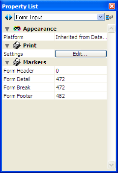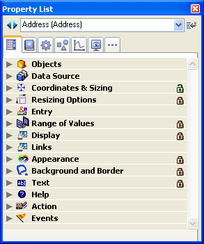 The user can view and edit the properties of objects present in the form using a simplified Property List. To display the list, simply double-click the object or choose the Property List command in the context menu of the editor (right-click).