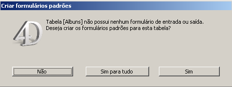Nota: Com a opção Criação automática de formulários nas Preferências, é possível fazer com que 4D crie automaticamente os formulários padrões sem exibir a caixa de diálogo. Para maiores informações, consulte o parágrafo Página Geral .
