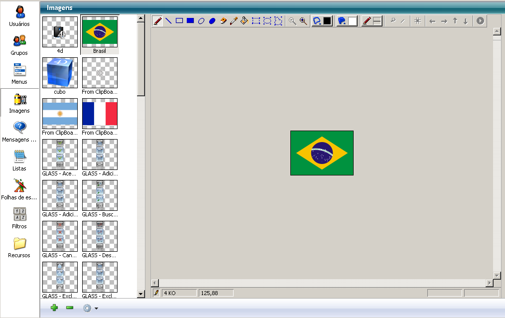 A biblioteca de imagens contém um editor de tipo Paint que lhe permite criar ou retocar imagens. Este é um ambiente ideal para desenhar botões e ícones, neste caso, as imagens são armazenadas no formato Pict.