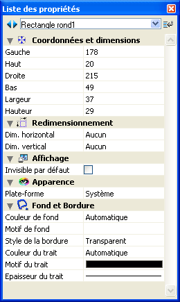 • Pour les objets graphiques ajoutés par l’utilisateur à l’aide de la barre d’objets, toutes les propriétés liées au type d’objet sont disponibles.