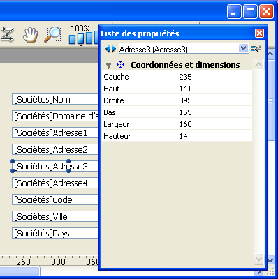 L’utilisateur peut visualiser et modifier les propriétés des objets présents dans le formulaire à l’aide d’une Liste des propriétés spécifique. Pour afficher la liste, il suffit de double-cliquer sur un objet ou de choisir la commande Liste des propriétés dans le menu contextuel de l’éditeur (clic droit pour afficher le menu).