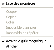 Lorsque l’utilisateur clique en-dehors de tout objet, les commandes globales d’affichage et d’édition de l’éditeur de formulaires sont accessibles : affichage de la Liste des propriétés, activation de la grille magnétique et choix des éléments à afficher et à masquer dans l’éditeur :