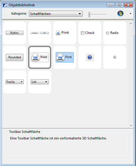 - Kategorie: Die Objekte sind in verschiedene Kategorien gegliedert, z.B. Schaltflächen, Eingabebereiche. Wählen Sie im PopUp-Menü am oberen Rand eine Kategorie, um die Auswahl einzuschränken oder Alle Kategorien, um alle Objekte anzuzeigen.