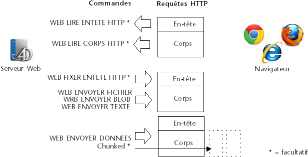 Fin de siCombinée à la commande WEB LIRE CORPS HTTP et aux autres commandes du thème “Serveur Web”, cette commande complète la gamme d’outils mis à la disposition des développeurs 4D pour traiter de manière entièrement personnalisée les connexions HTTP entrantes et sortantes. Ces différents outils sont présentés dans le schéma suivant :