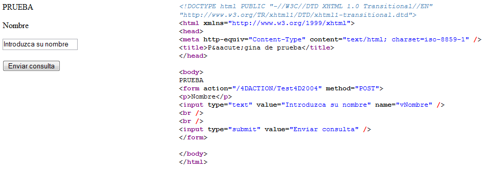 En este ejemplo, una solicitud simple se envía al servidor web de 4D y el contenido del campo HTTP cuerpo se visualiza en el depurador. Este es el formulario enviado al servidor web de 4D, así como también el código HTML correspondiente: