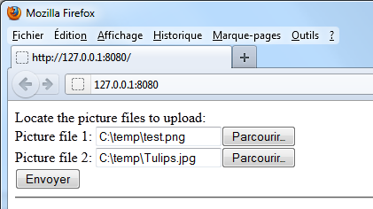 Dans cet exemple, un formulaire Web permet de télécharger sur le serveur HTTP plusieurs images depuis un navigateur et de les afficher dans la page. Voici le formulaire Web :
