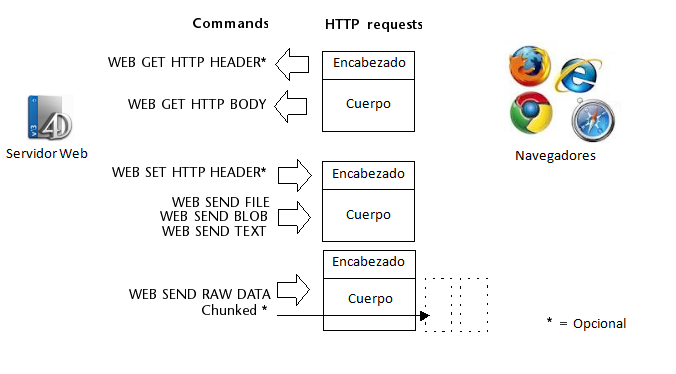 End ifCombinado con el comando WEB GET HTTP BODY y con los otros comandos del tema “Servidor web”, este comando completa el rango de herramientas disponibles para los desarrolladores 4D para tratar de manera completamente personalizada las conexiones HTTP entrantes y salientes. Estas herramientas se presentan en el siguiente diagrama: