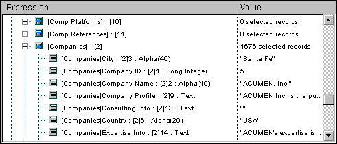 This theme lists the tables and fields in the database; it does not list subfields. For each Table item, the Value column displays the size of the current selection for the current process as well as (if the Table item is expanded) the number of locked records. For each Field item, the Value column displays the value of the field (except picture, subtable, and BLOB) for the current record, if any. In this theme, the field values can be modified (there is no undo), but the table information cannot.