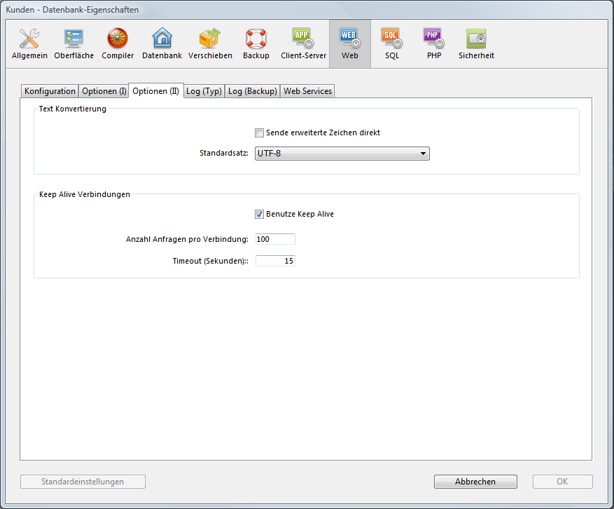Diese Option ermöglicht, das Aufrechterhalten von TCP Verbindungen für den Web Server zu aktivieren/deaktivieren. Sie ist standardmäßig aktiviert. Das ist für die meisten Fälle sinnvoll, das es den Austausch beschleunigt. Unterstützt der Web Browser nicht die Option keep-alive, wechselt der 4D Web Server automatisch zu HTTP/1.0.