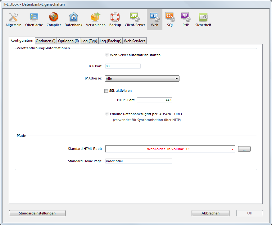 Sie können die Operation des 4D Web Server in den Datenbank-Eigenschaften unter dem Thema Web konfigurieren. Dieser Abschnitt beschreibt die Seiten Konfiguration, Optionen (I) und Optionen (II).