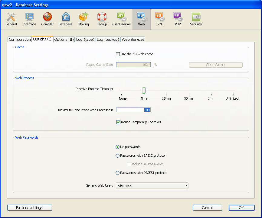 データベース設定のWeb ページで定義されたパラメタを使用して、4D Webサーバの動作を設定できます。この節ではこのページの設定 、オプション (I) と (II) について説明します。