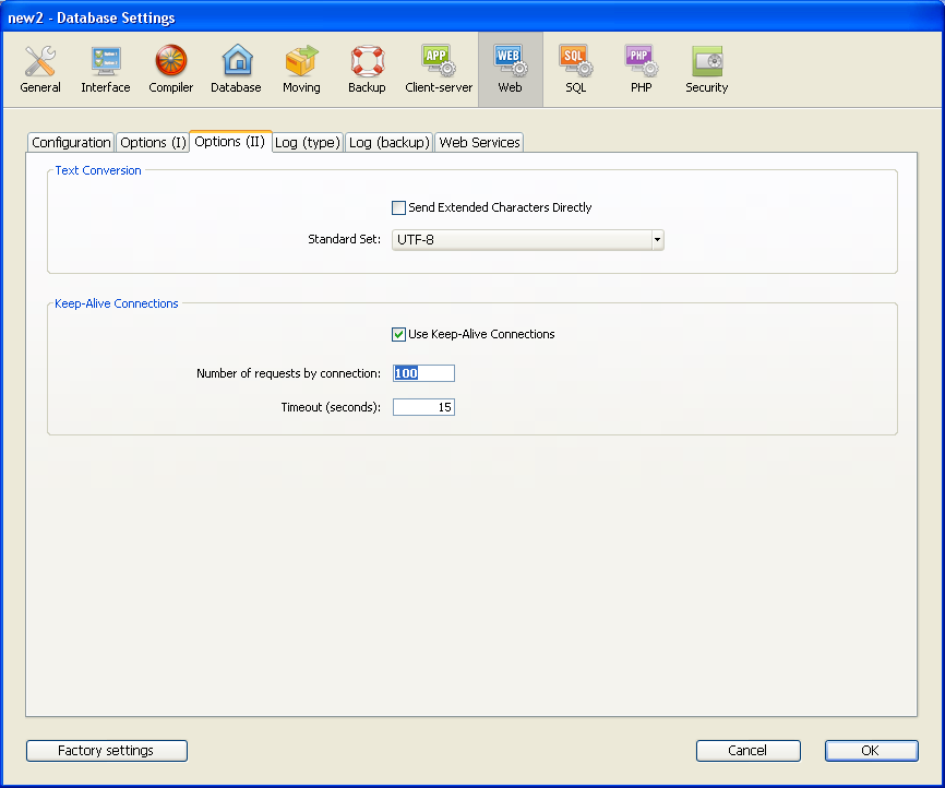 スタンダードセット ドロップダウンリストを使用して、4D Webサーバが使用する文字セットを定義できます。デフォルトで文字セットはUTF-8です。4DのWebサーバはKeep-Alive接続を使用できます。Keep-Aliveオプションを使用して、一つの開かれたTCP接続でWebブラウザとサーバ間の一連のデータ交換を保守し、システムリソースを節約して、通信を最適化できます。