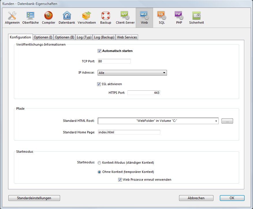 Um den Web Server beim Öffnen der 4D Anwendung immer automatisch zu starten, gehen Sie in den Datenbank-Eigenschaften auf die Seite Web>Konfiguration: