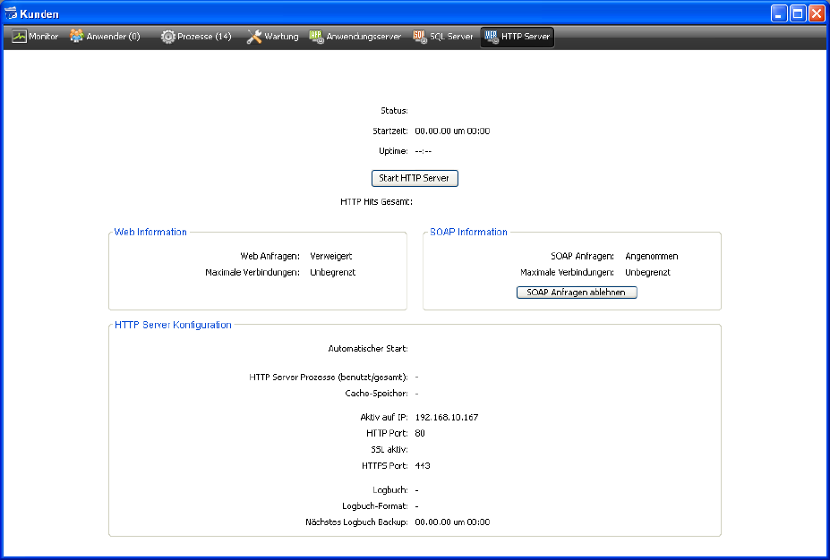 Der Prozess Web Server hat nur die Aufgabe, die Versuche für eine Verbindung zum Web zu verwalten. Das Starten des Prozesses Web Server bedeutet also nicht, dass Sie eine aktuelle Verbindung zum Web öffnen, sondern lediglich, dass Web Anwender Web-Verbindungen aufbauen können. Das Abbrechen des Prozesses Web Server bedeutet nicht, dass Sie derzeit laufende Web Verbindungsprozesse - sofern vorhanden - schließen, sondern lediglich, dass Web Benutzer nicht länger neue Web Verbindungen herstellen können.