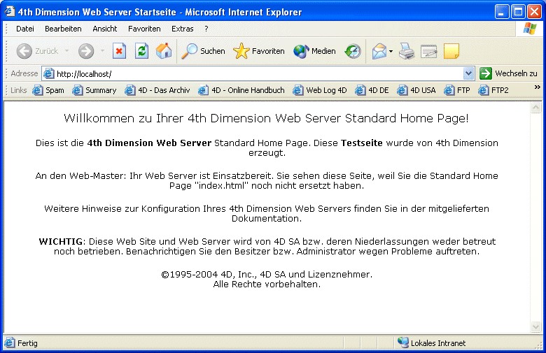 Ihr Browser sollte nun die Home Page Ihrer Web Site anzeigen. Bei Veröffentlichen der Datenbank mit der Standardeinstellung sollte die Home Page des 4D Web Servers erscheinen. Auf dieser Seite können Sie die Verbindung und die Server Operation prüfen. Es können auch folgende Situationen eintreten: